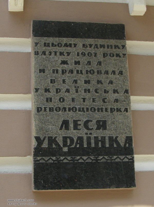 З 25 липня до 8 серпня 1907 у квартирі № 11 на третьому поверсі флігеля жили після одруження Леся Українка і К. Квітка. 1955 на фасаді головного будинку встановлено мармурову меморіальну дошку, 1971 замінено на дошку з чорного граніту на честь Лесі Українки (арх. В. Шевченко).