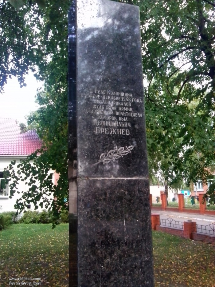 Пам’ятний знак про перебування в листопаді – грудні 1943 в селі Колонщина полковника Брєжнєва Лєоніда Ілліча, майбутнього Першого секретара ЦК КПСС (1964—1966), Генерального секретара ЦК КПСС (1966—1982). Голови Президії Верховної Ради СРСР у 1960–1964 і 1977–1982 роках. Маршала Радянського Союзу. Чотириразового Героя Радянського Союзу (1966, 1976, 1978, 1981). Героя Соціалістичної Праці (1961). Лауреата Ленінської премії з літератури (1979).