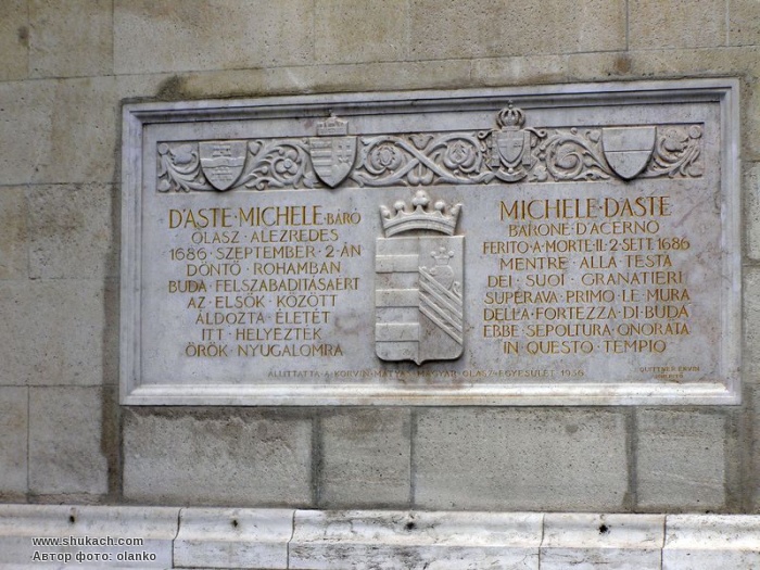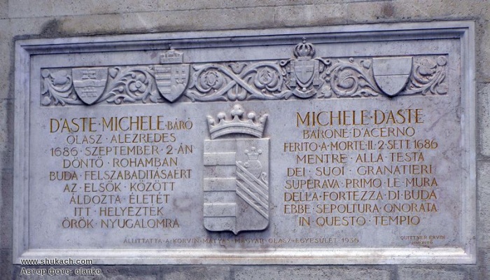 Надгробна плита вмурована у південно-східну стіну собору св. Матяша. На плиті надпис «Мішель д’Асте, барон д’Ацерно, загинув 2 вересня 1686 року, віддавши своє життя за звільнення Будайської фортеці, і спить тут вічним сном». Архітектор Ервін Кітнер, плита встановлена у 1936 році.