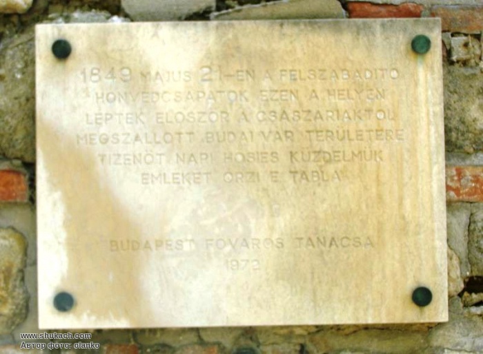 21 травня 1849 року війська визвольної армії вперше увійшли в район Будайського замку, окупованого імперською армією. На честь їх героїчної боротьби на протязі п’ятнадцяті діб, яка завершилась оволодінням замком, у 1972 році встановлена ця меморіальна дошка.