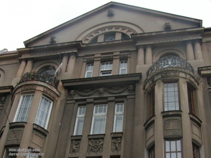 Вікна бічних частин п’ятого поверху мають півциркульні завершення, над еркерами – прикрашені з двох сторін подвійними стилізованими півколонами тосканського ордеру. Вхід в будинок підкреслений масивним порталом.