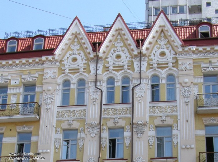 Характерною особливістю ліпленого оздоблення є рослинні, зоо- та антропоморфні мотиви, що тяжіють до стилістики модерну. Привертають увагу вертикальні панно із зображенням переплетених риб (сомів) у міжвіконнях другого поверху, різноманітні жіночі й чоловічі маски в оточенні площинного орнаменту. Первісні інтер'єри квартир в стилі модерн не збереглися. Споруда виділяється виразним силуетом та вдалим поєднанням на фасаді цегляних і ліплених деталей.