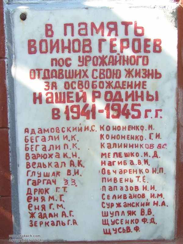 сел. Урожайне. Братська могила і пам'ятний знак загиблим землякам.