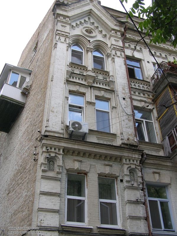 Побудований у 1896-1897 роках. Автор проекту – арх. М. Гарденін, який здійснював також керівництво будівельними роботами і нагляд за ними. В ході реалізації проект було змінено: пірамідальне завершення по осі бічного проїзду не зведено, побудовано додатковий мансардний поверх. Триповерховий з цокольним і мансардним поверхами, цегляний, пофарбований, у плані складної конфігурації. Первісне планування з однією квартирою на поверсі істотно не змінилося. Вирішений у цегляному стилі з використанням елементів неоготики. Памʼятка архітектури.