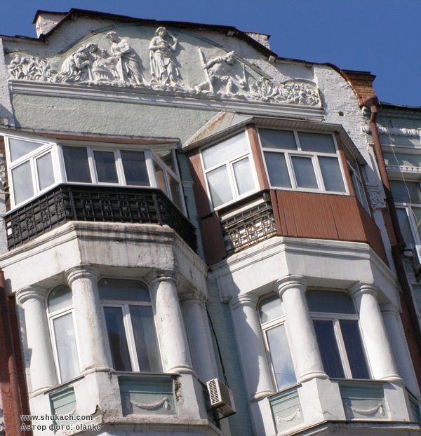 Центр будинку акцентовано також здвоєними тригранними еркерами, які охоплюють другий—п'ятий поверхи, їхній верхній ярус оформлено елементами тосканського ордера, інші яруси вирішено суто конструктивно й декоровано орнаментальними вставками й гладенькими панелями. Між третім та четвертим поверхами грані еркерів прикрашено трьома парами рельєфів, що відтворюють античні сцени побуту та відпочинку. Деякі з постатей запозичено з розписів вілли Містерій у Помпеях. З мистецької точки зору ці рельєфи (так само, як і горельєф аттика) не піднімаються над загальним тогочасним рівнем і мають винятково декоративне, проте важливе для ансамблю значення. Знизу еркери прикрашено смугами пластичного орнаменту з геометризованих квіткових розеток, пелюстки яких своєю формою нагадують листя улюблених киянами каштанів.