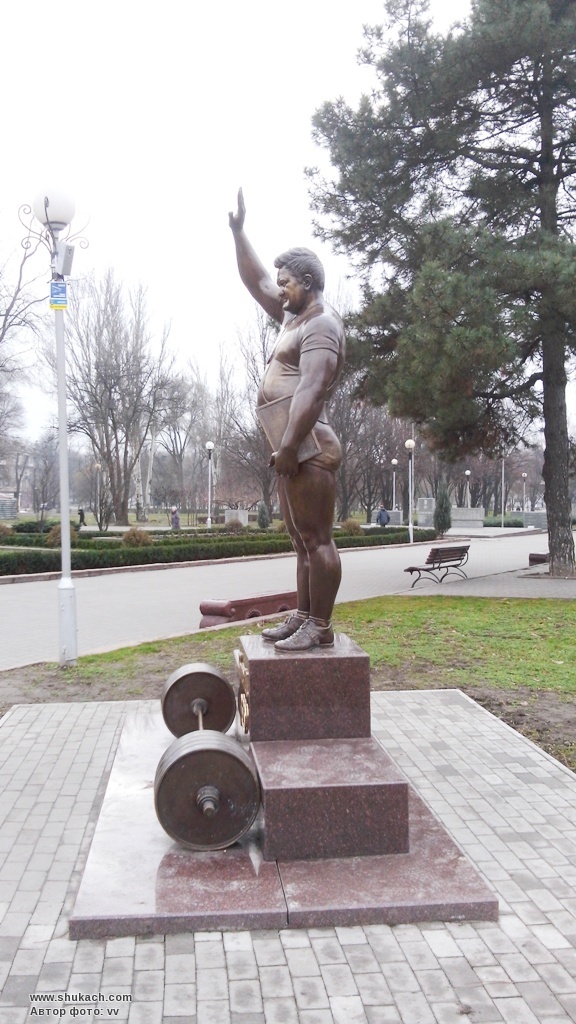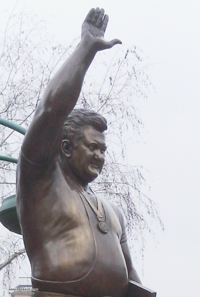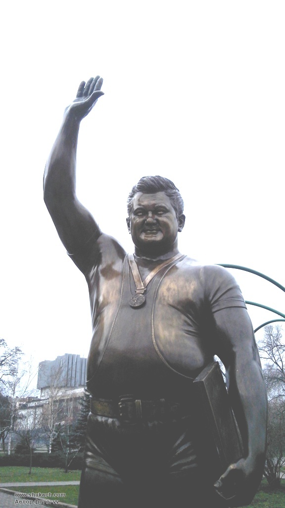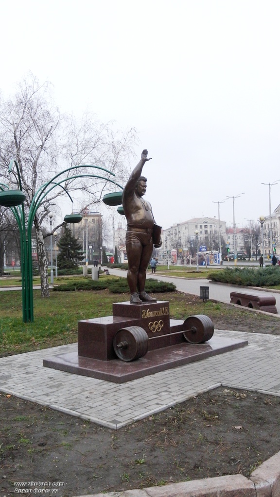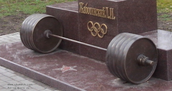 важкоатлету, уродженцю Сумщини Леонідові Жаботинському. Скульптурна композиція,