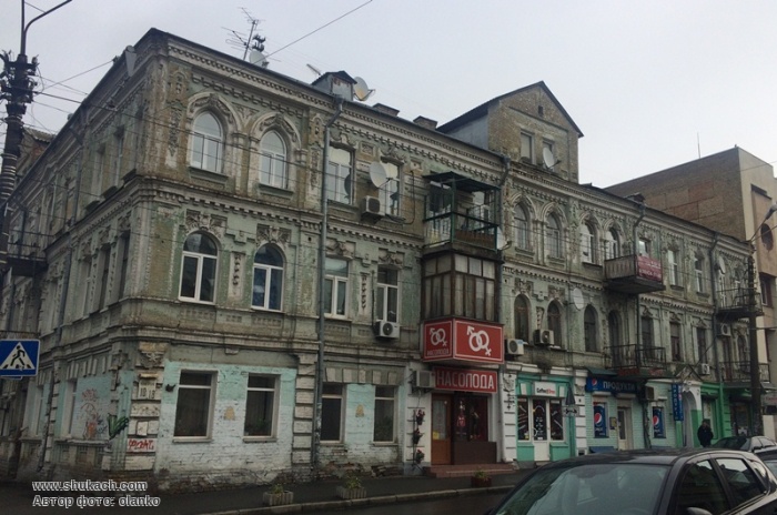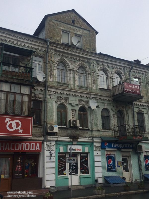 На розі вул. Межигірської, на червоних лініях забудови вулиць. Складається з двох різних за часом побудови об'ємів. 1888 зведено наріжний двоповерховий будинок, який бл. 1898 надбудовано. 1900 впритул до нього на червоній лінії забудови вул. Межигірської споруджено триповерховий будинок; підписку про нагляд за будівництвом надав арх. М. Клуг. Обидва об'єми з мезонінами, фасади на вул. Межигірській об'єднує ідентичний декор. Триповерховий з двома мезонінами (на одну квартиру кожний), мурований, пофарбований, у плані прямокутний. Перекриття пласкі. Покрівля даху бляшана. Пам’ятка архітектури.