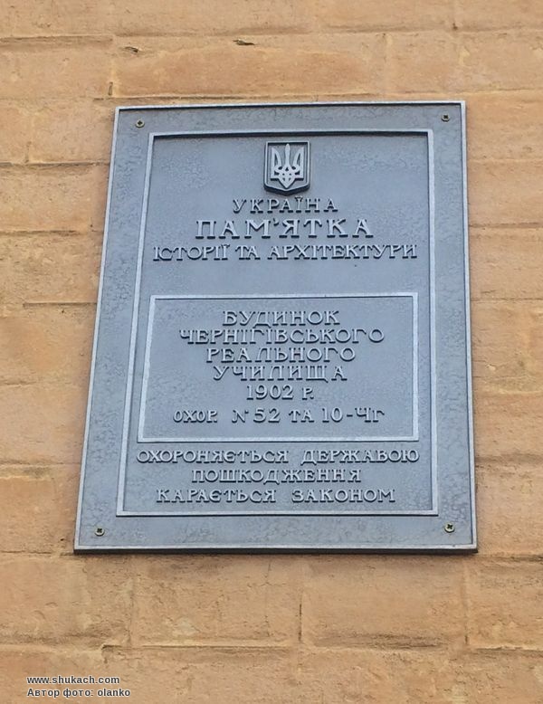 Будинок був зведений в 1902 році по проекту архітектора Д. В. Савицького для Чернігівського реального училища. На початку 1915 року реальне училище мало 7 основних та 1 підготовчий класи, кількість учнів на цей період - 286.