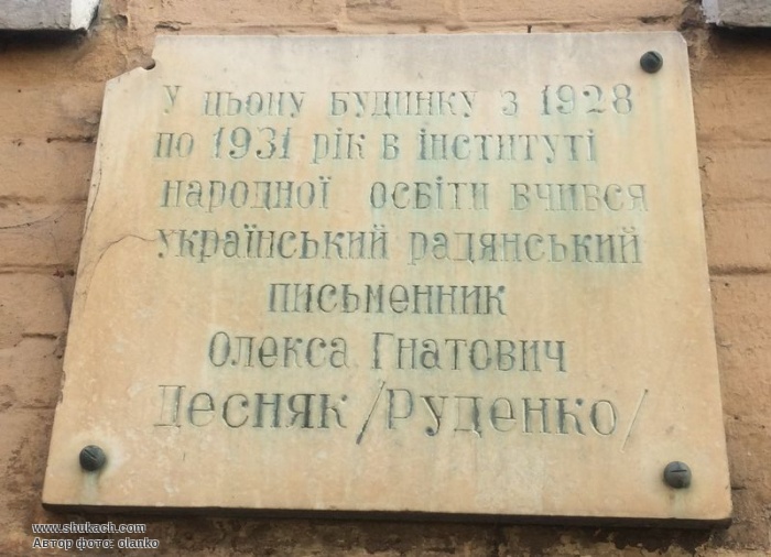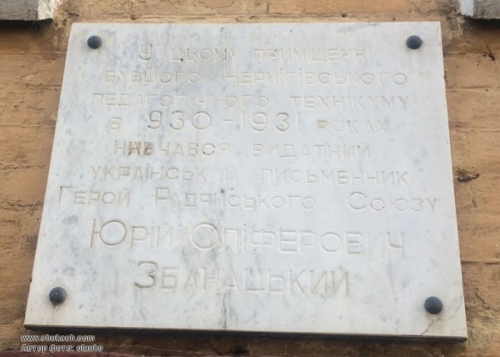 На фасаді будинку – меморіальні дошки письменникам Олексі Десняку і Юрію Збанацькому, які тут навчались.