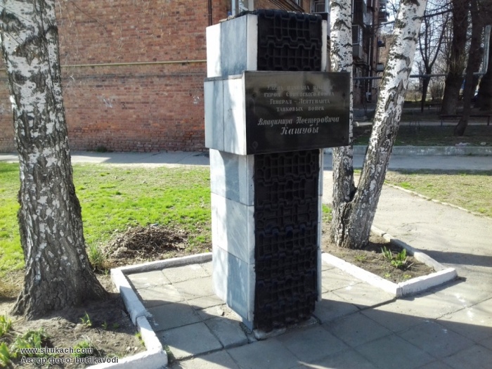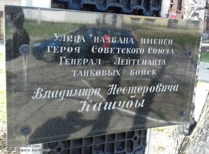 Біля будинку № 3 на вул. Кашуби знаходиться стела, оздоблена частиною танкової гусениці та з анотаційною дошкою, яка роповідає на честь кого названо вулицю.