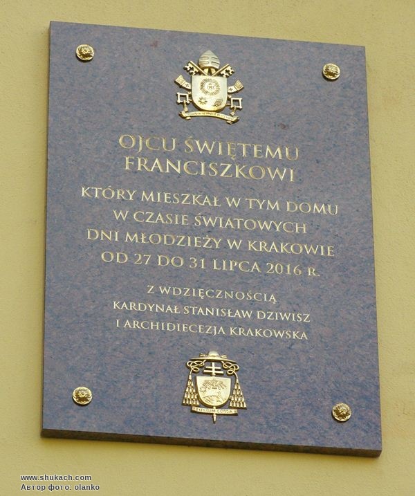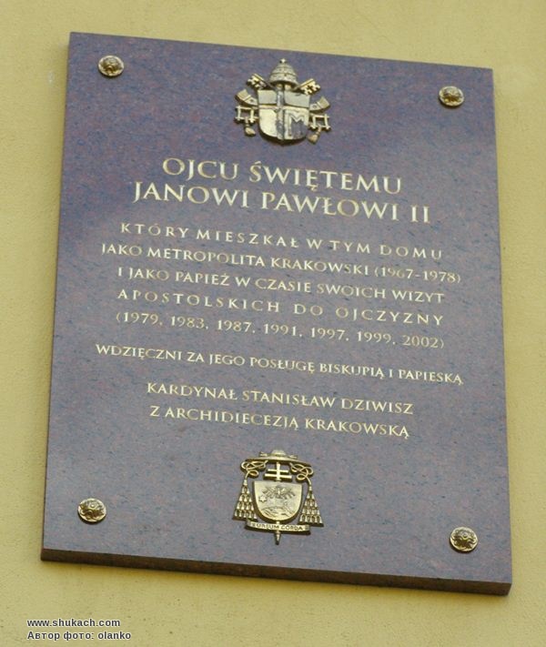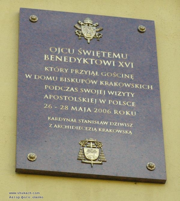 На стіні внутрішнього подвіря палацу біскупів встановлені три меморіальні дошки в пам'ять перебування тут римських пап: Іоанна Павла ІІ – у якості митрополита Краківського – у 1967-1978 роках, і як папи римського – у 1979, 1983, 1987, 1991, 1997, 1999 і 2002 роках; папи Бенедикта ХVI – у 2006 році, папи Франциска – у 2016 році.