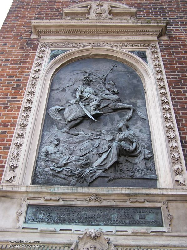 По ліву сторону від головного входу встановлений великий барельєф на честь 200-ліття перемоги короля Яна Собеського в битві під Віднем. Це робота Піуса Вілонського, копія картини Яна Матейки «Собеський під Віднем». Оригінал був подарований у Ватикан, де знаходиться до цього дня.