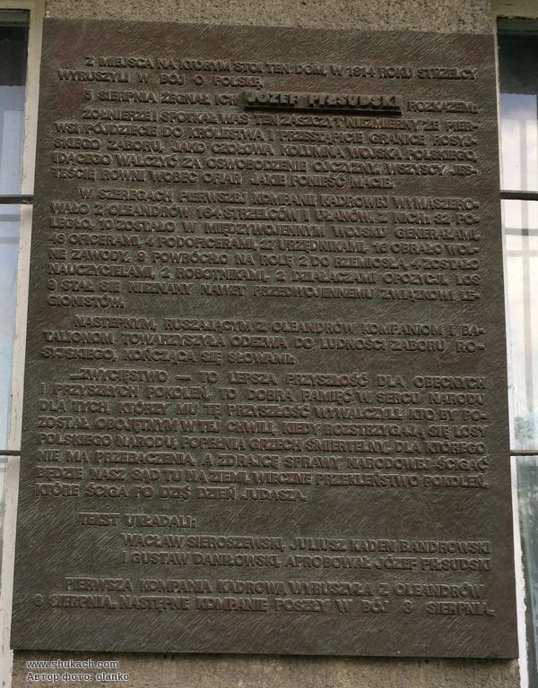 На будинку встановлена меморіальна дошка з цитатами з промови Юзефа Пілсудського перед польськими легіонерами у 1914 році.
