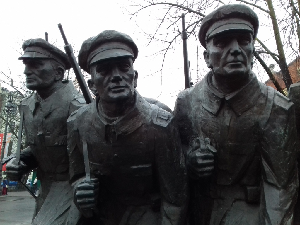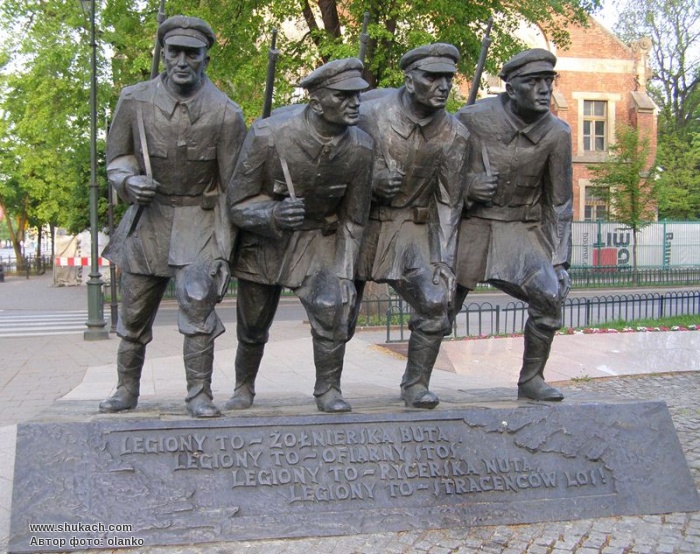 Скульптурна група зображує легіонерів, які рушають у похід з краківських Олеандрів. На постаменті – приспів їх пісні «Ми, перша бригада». Флагшток уповитий гірляндою лаврів і троянд.