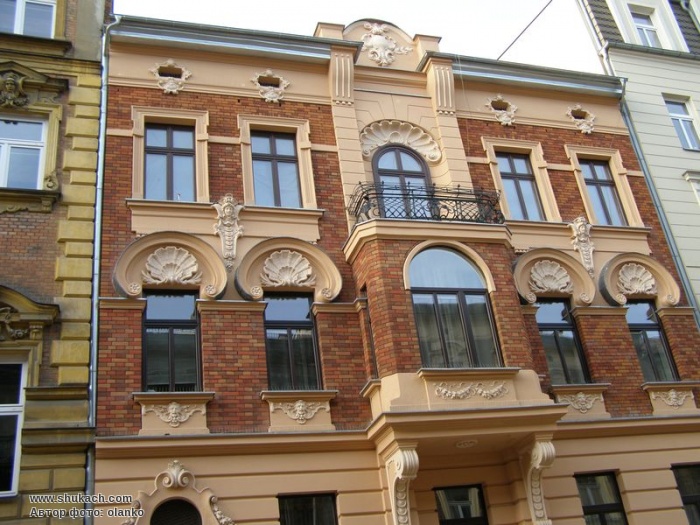 Будинок виділяється яскравим фасадом і багатою ліпниною, художнім обрамленням вікон, кованою решіткою балкону.