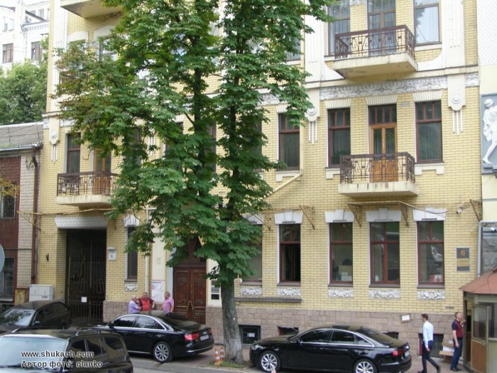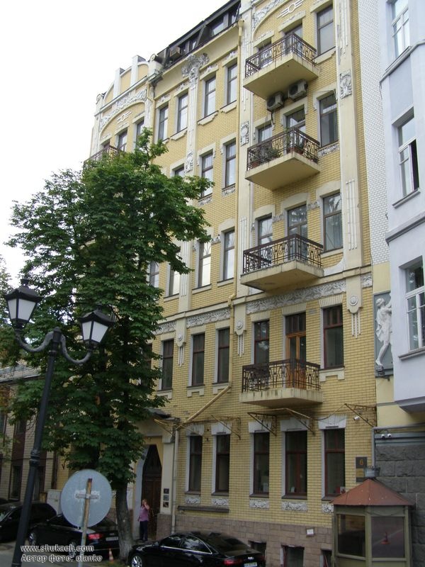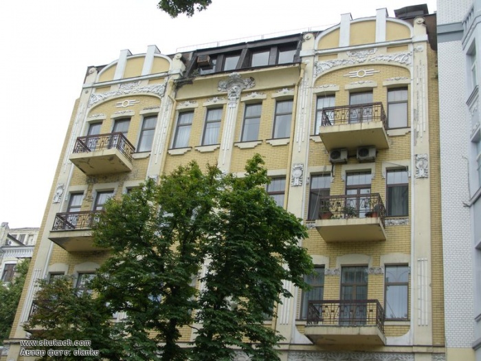 П'ятиповерховий, цегляний, односекційний, з цокольним поверхом, у плані Т-подібний. Кожний поверх розрахований на дві квартири. Композиція головного фасаду, зверненого до Національного художнього музею, симетрична. Цьому не заважають розташований з лівого боку проїзд на подвір'я та зміщений відносно центральної осі парадний вхід з ліпним порталом.