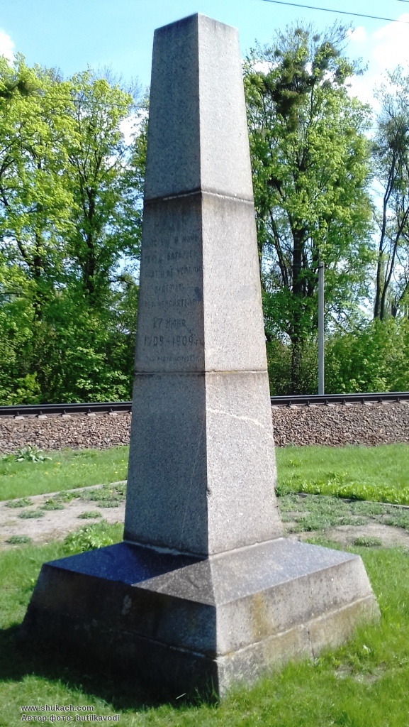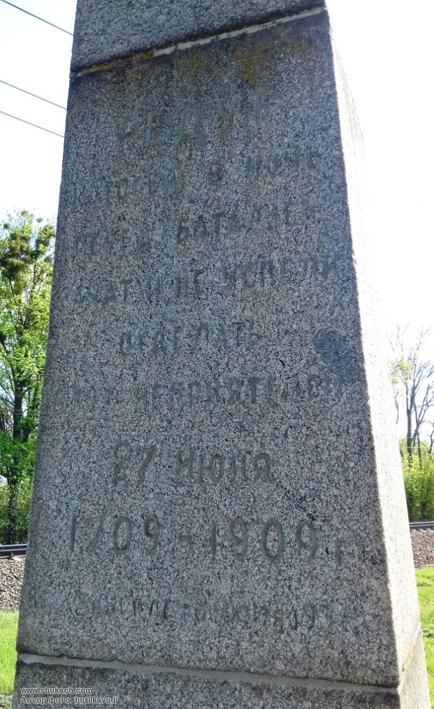 "Редут, который в ночь перед баталией зачат и не успели отделать. Взят неприятелем. 27 июня 1709-1909 гг. Восстановлен 8 июля 1939 г."