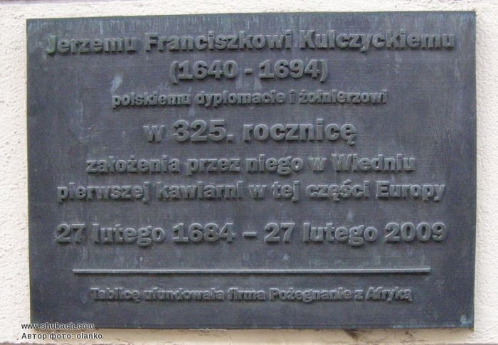 Дуже невеличка меморіальна дошка, яку не кожен турист помітить, - на честь дипломата, військового і підприємця Юрія Кульчицького. Українці вважають його українцем, а поляки – поляком. Меморіальна дошка встановлена 27 лютого 2009 року, у 325-ту річницю відкриття першої кав’ярні у Відні. Юрій Кульчицький – людина, яка поміж інших своїх заслуг навчила Східну Європу пити каву.