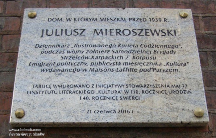 Польський журналісті публіцист Юліуш Мєрошевський (1906-1976) жив у цьому будинку до 1939 року. Меморіальна дошка встановлена у 2016 році.