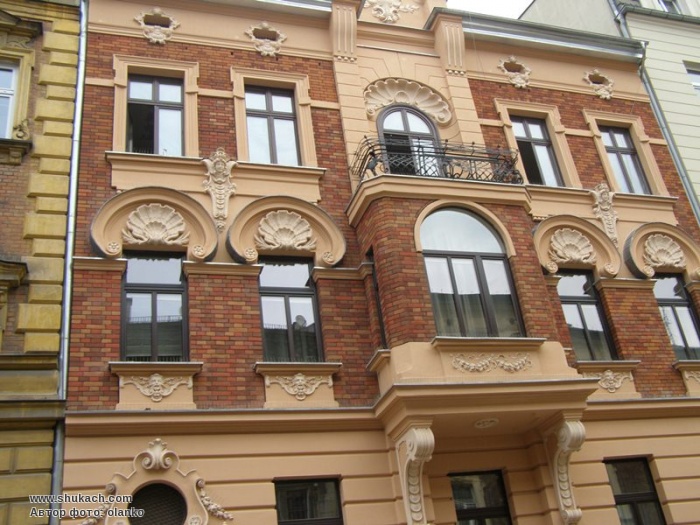 Фасад будинку з червоної цегли прикрашають розкішні обрамлення вікон, еркер, балкон і вхідний портал у стилі бароко.