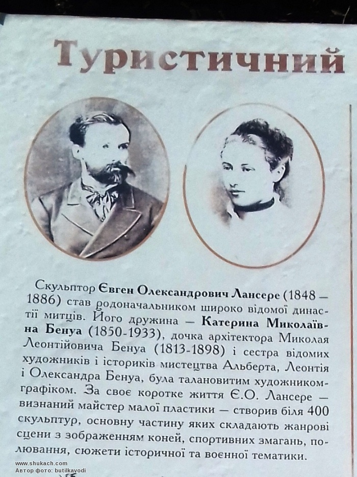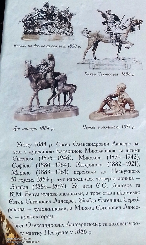Серед пустирю в центрі села Нескучне є одинока могила. Тут похований колишній володарь села та маєтку Лансере Євген Олександрович. На 100% невідомо місце поховання Євгена Лансере - цей хрест в становлений у 1990-х роках шанувальниками-ентузіастами на місці ймовірного поховання (за згадками та описами) - ту стояла церква з родиннимсклепом Лансере. Можна вважати цю могилу пам'ятним знаком.
