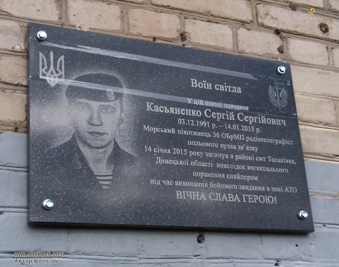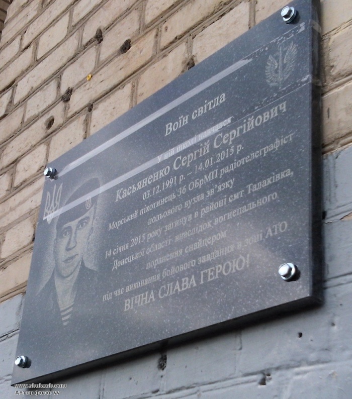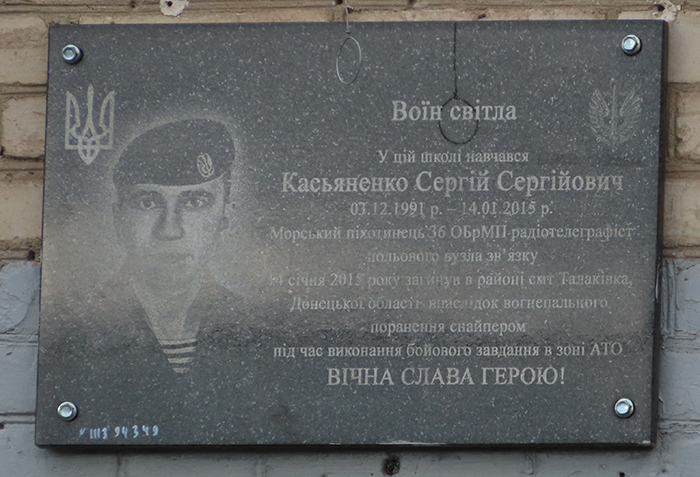 Меморіальна дошка Сергію Сергійовичу Касьяненко (1991-2015) встановлена на будинку школи №42, (вулиця Шевченка, 277), де він навчався. Сергій Касьяненко був старшим матросом, радіотелефоніст 1-го окремого батальйону морської піхоти. Загинув біля Маріуполя в районі смт. Талаківка.