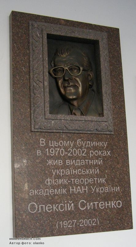 Встановлена на фасаді будинку, в якому у 1970-2002 роках жив видатний фізик-теоретик, академік О.Г.Ситенко. Урочисте відкриття дошки відбулось 18 лютого 2014 року.