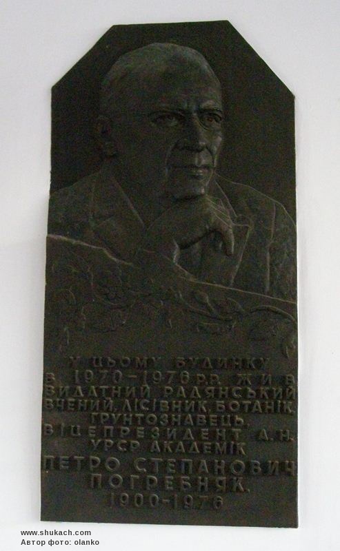 Встановлена у 1979 році на фасаді будинку, в якому у 1970-1976 роках жив видатний вчений-ботанік, віце-президент Академії наук УРСР П.С.Погребняк. Автори - скульптор І. М. Гончар, архітектор А. Ф. Ігнащенко.