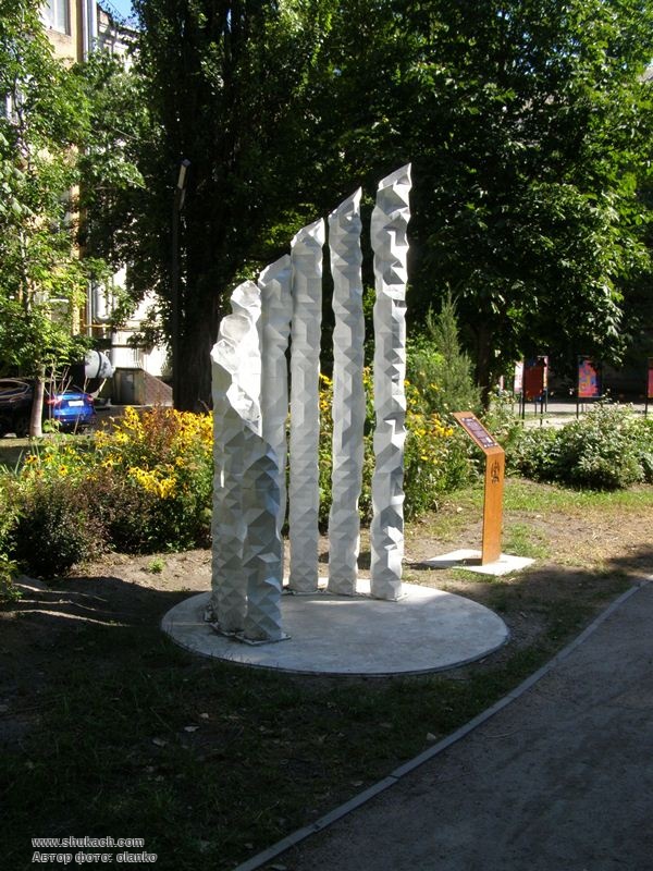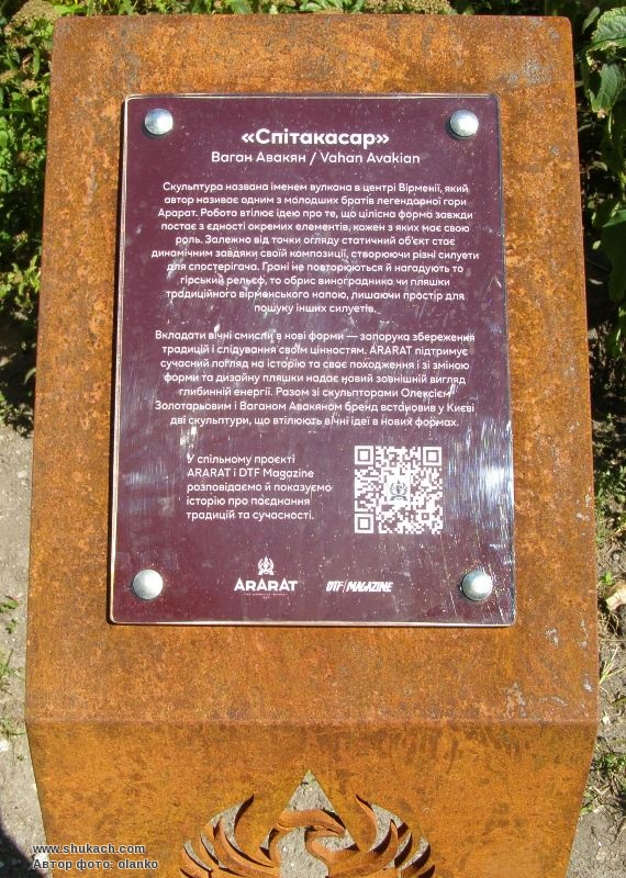 Скульптура «Спітакасар» Вагана Авакяна бере назву від вулкана в центрі Вірменії. Автор називає його одним з молодших братів легендарної гори Арарат. Робота втілює ідею про те, що цілісна форма завжди постає з єдності окремих елементів, кожен з яких має свою роль. Залежно від точки огляду статичний об’єкт стає динамічним завдяки своїй композиції, створюючи різні силуети для спостерігача. Грані не повторюються й нагадують то гірський рельєф, то обрис винограднику чи пляшки традиційного вірменського напою, лишаючи простір для пошуку інших силуетів. Встановлена у Сквері київських інтелігентів у серпні 2021 року.