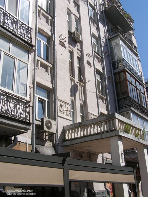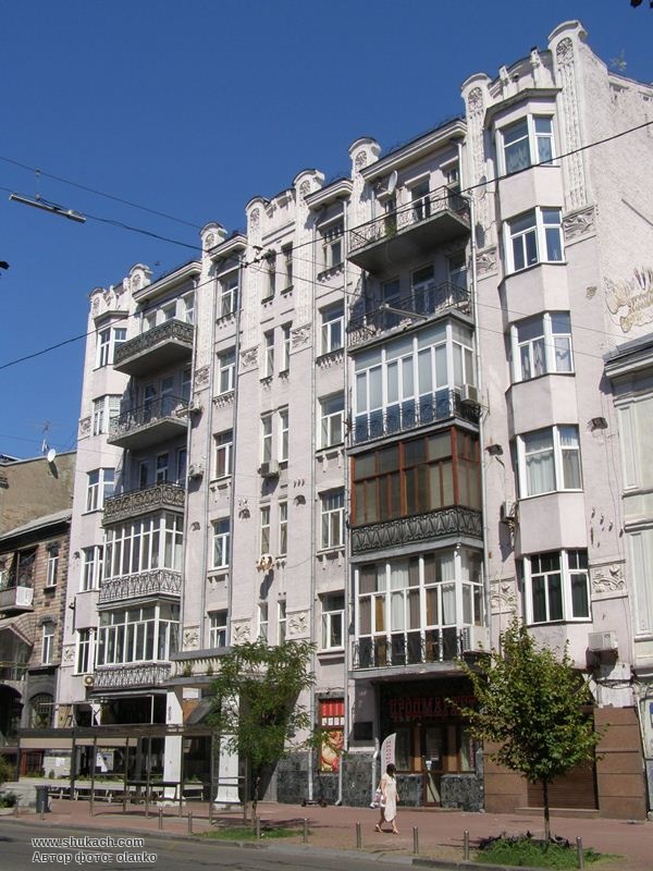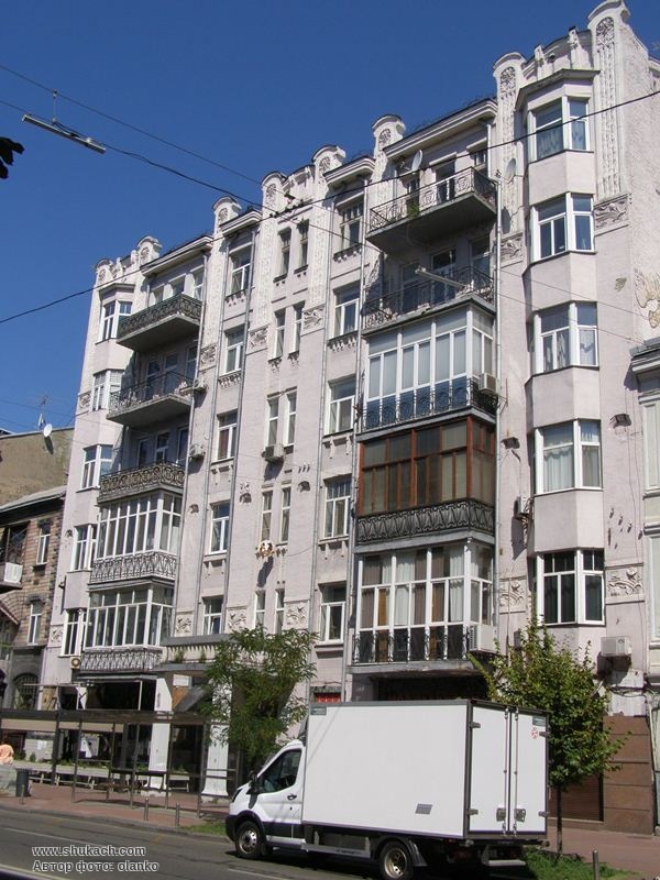 Фасадний будинок домінує в ряді забудови кварталу. Зведений у 1911 році 7-м Київським товариством квартировласників. Шестиповерховий, цегляний, з підвалами. Перекриття плоскі. Планування секційне. Фасадний будинок у плані прямокутний, з невеликим ризалітом у бік подвір'я об'єму кухонь і чорних сходів. На поверсі було по дві п'ятикімнатні квартири.