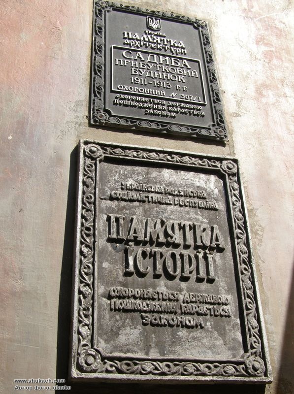 Будинок вирішено у стилі модерн із застосуванням ідентичних елементів декоративної пластики, завершень, оздоблення. Композиція фасаду чолового будинку симетрично-осьова, підкреслена центральним положенням входів, балконами й еркерами, які відповідають розташуванню парадних кімнат. Вхід до будинку з боку вулиці виділено балконом на стовпах. Пам’ятка архітектури і історії.