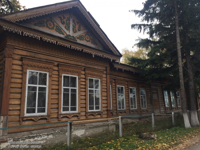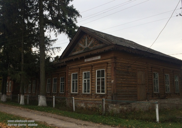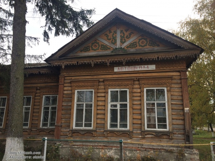 Одноповерхова будівля з рясно прикрашеними дерев’яним різьбленням карнизом і лиштвами вікон.
