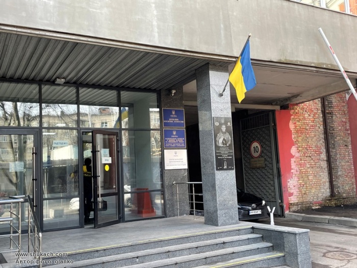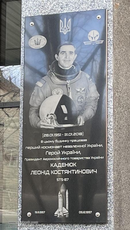 Меморіальна дошка встановлена на фасаді будівлі Державного космічного агентства України, де працював Л.К.Каденюк.