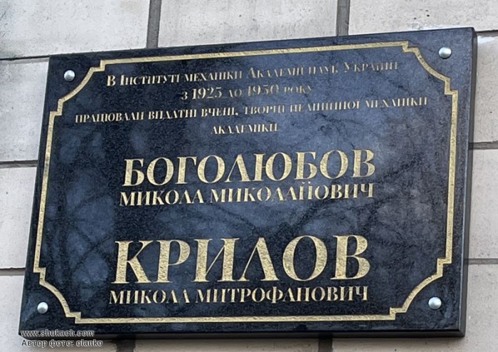 Встановлена у 2021 році на фасаді інституту механіки НАН України на честь всесвітньо відомих вчених, академіків М.М.Боголюбова і М.М.Крилова, які працювали тут з 1925 по 1950 рік.