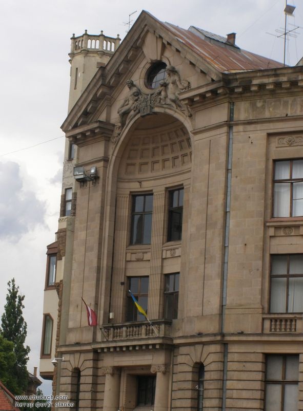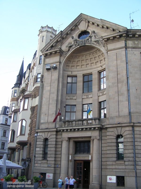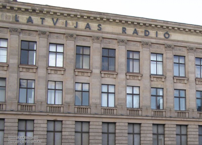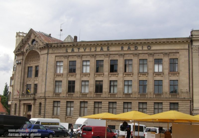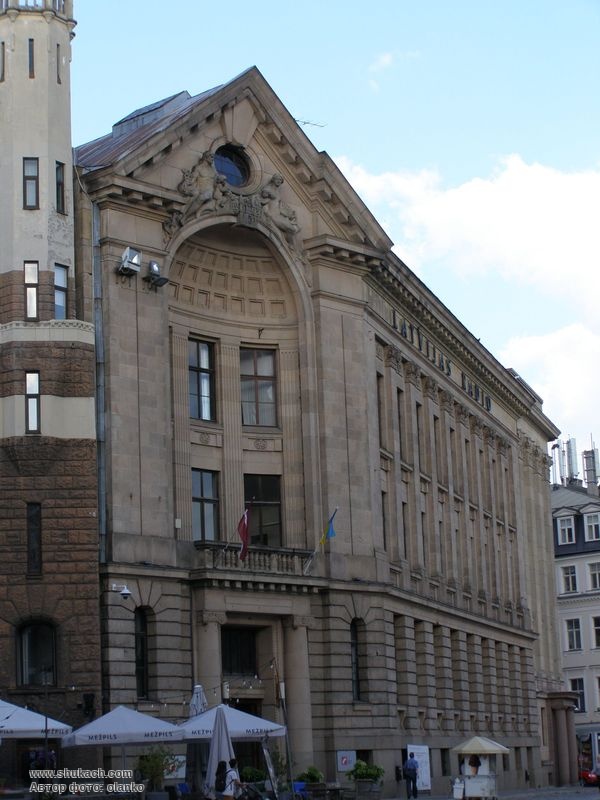 Будівля в стилі неокласицизму зведена у 1913 році за проектом архітектора Пауля Мандельштама для розміщення Ризького комерційного банку. Головний вхід вінчає скульптурна група «Золотий вік» з гербом Риги. Зараз тут розміщені Латвійське радіо і декілька приватних радіостанцій.