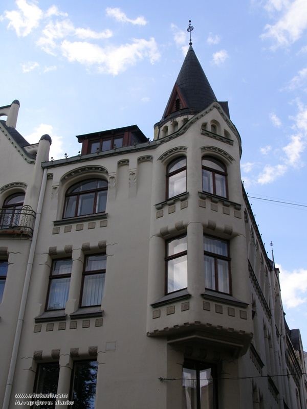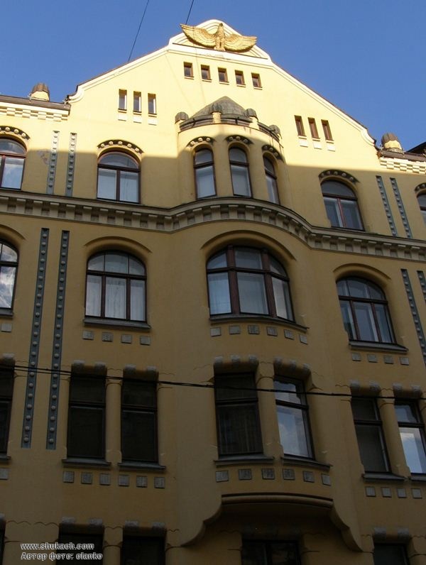 Будинок зведений у 1909 році за проектом архітектора Фрідріха Шефеля, який разом з Генріхом Шелом вважається піонером ризького югендстилю. Власником цього будинку був один багатий латиський торговець, якого не прийняли у Велику гільдію. Він настільки сильно образився на таке рішення, що на даху свого будинку розташував дуже експресивні постаті котів, повернутих хвостами до будівлі Великої гільдії, таким чином недвозначно висловлюючи своє ставлення до об'єднання торговців.