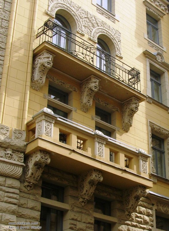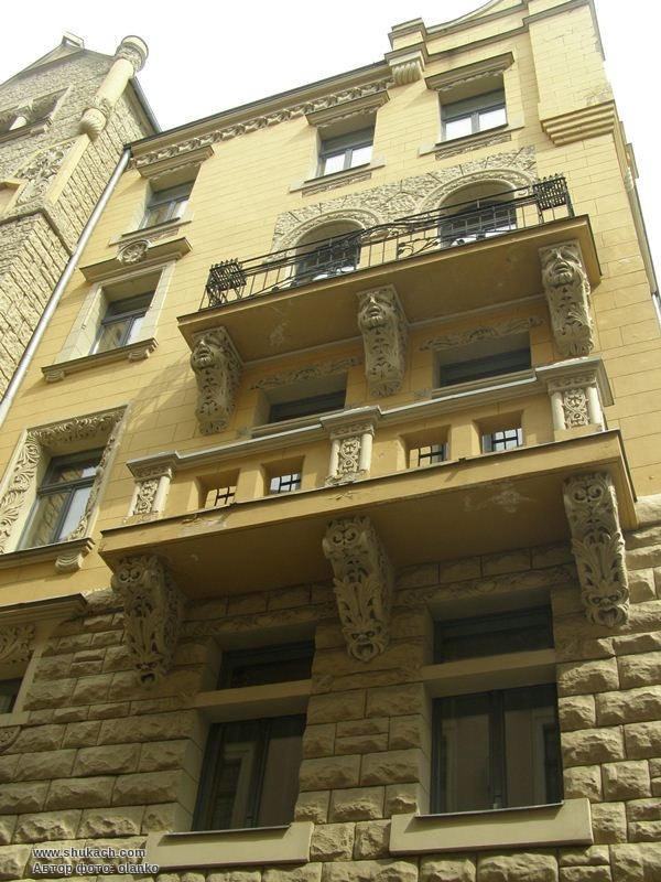 Еклектичні мотиви неоренесансу чергуються з орнаментами у стилі модерн. Фасад будівлі з балконами та еркерами прикрашений стилізованим рослинним орнаментом. Центральний вхідний портал будівлі прикрашений монументальним маскароном у вигляді жіночої голови із сонячним мотивом на задньому плані. Пам’ятка архітектури національного значення.