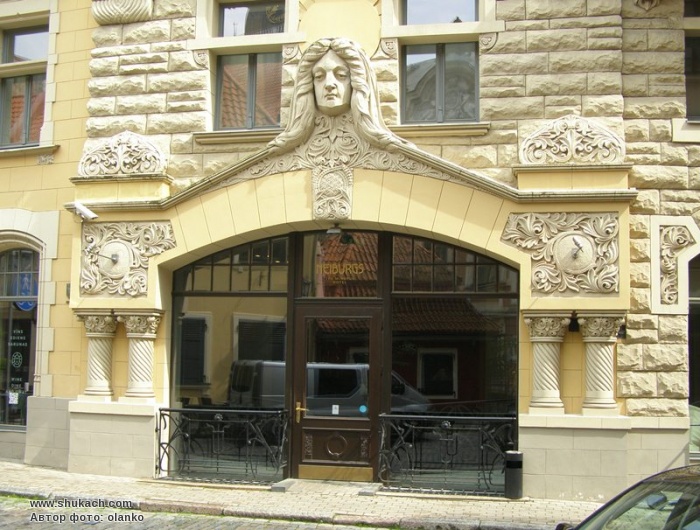 Зведений у 1903-1904 роках за проектом архітектора Вільгельма Людвіга Бокслаффа на замовлення будівельного підрядника Людвіга Нейбурга. В будівництві використані елементи еклектики і стилю модерн. Нова будівля була зведена на місці кількох будівель Старої Риги. Щоб ця будівля краще вписувалася в середовище Старого міста, архітектор розділив її на кілька обсягів, надавши кожному різну декоративну обробку.