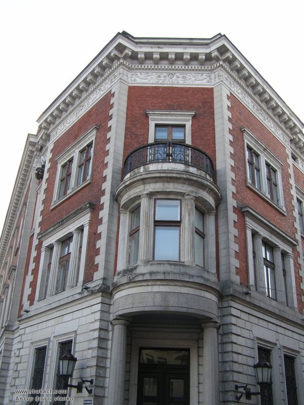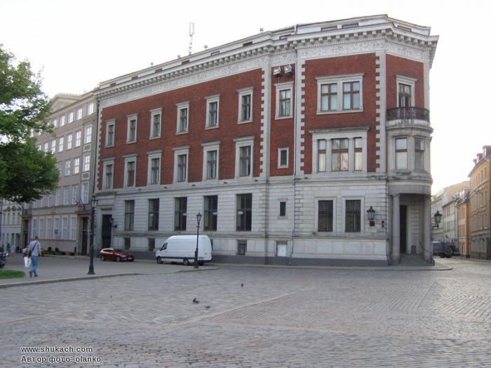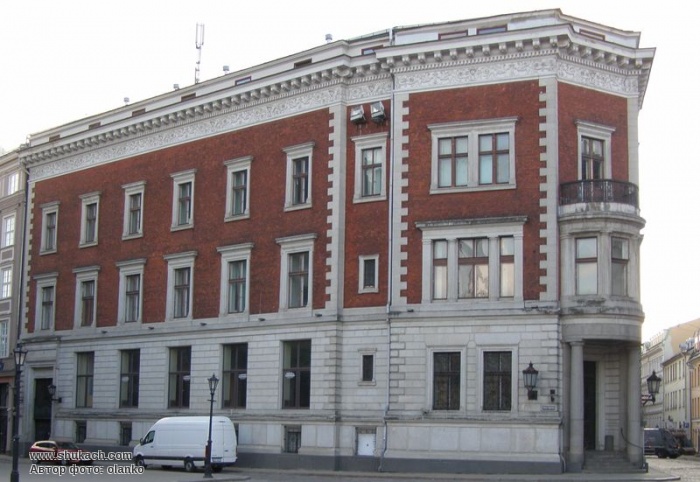 Триповерхова будівля зведена у 1887 році за проектом архітектора Генріха Шеля для розміщення Ризького біржового банку. У 1927 році перебудований за проектом архітектора Ніколая Герцберга. Фасад виділений тонованою цеглою і широким ліпним фризом. Перший поверх фасадів рустований. На зрізаному вузькому наріжжі – напівкруглий еркер (на другому поверсі) і балкон (на третьому поверсі). Пам’ятка архітектури національного значення.