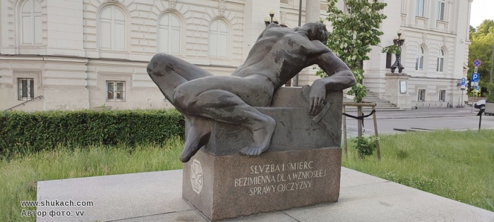назад головою, який тримає в лівій руці короткий меч. Пам'ятник відкрито 10 листопада 1933 року. Він стояв на місці, де в 1918 році Юзеф Пілсудський приймав парад військовополонених з балкону палацу Кроненберг .