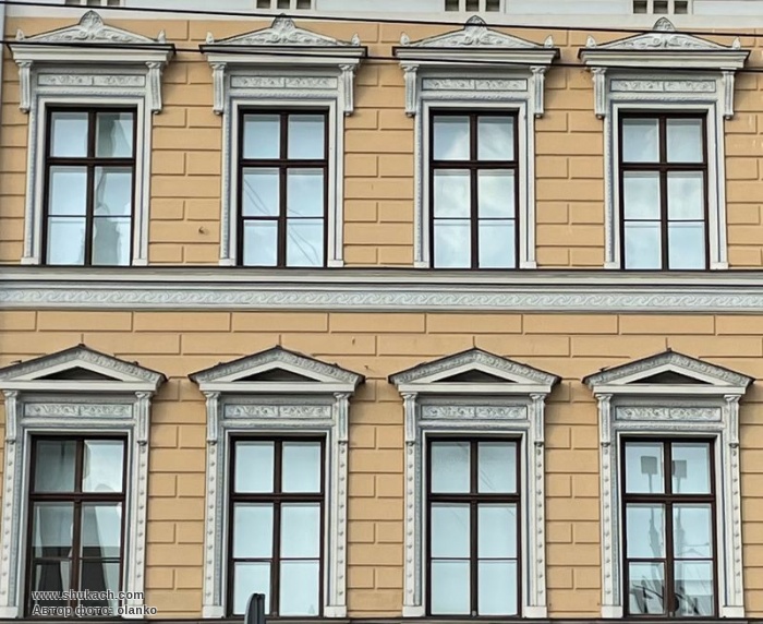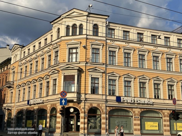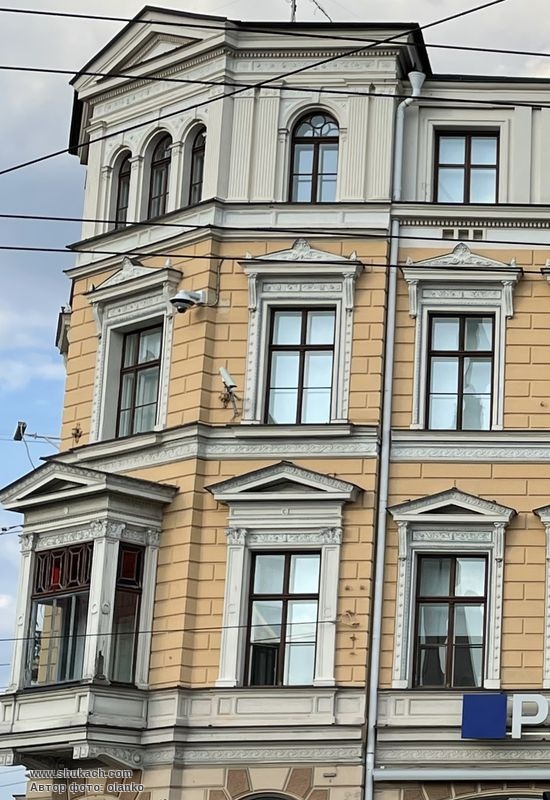 Чотириповерховий наріжний прибутковий будинок зведений у 1868 році. Фасади рустовані, вікна прикрашені трикутними сандриками і ліпним обрамленням. На зрізаному наріжжі – балкон з колонами. Пам’ятка архітектури.