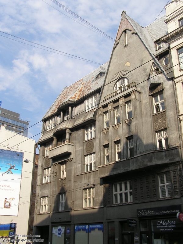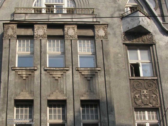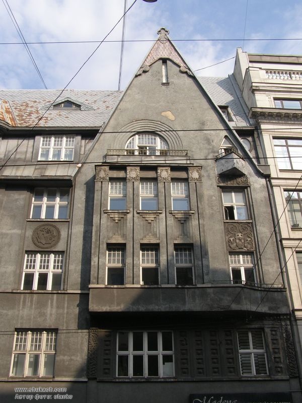 Прибутковий будинок зведений у 1909 році за проектом архітектора Ейзена Лаубе. Типовий зразок національного романтизму. У виразно асиметричній, темно-сірій тональності фасадної композиції переважають архітектурні елементи – еркери, лоджії, балкони, площини даху та високі фронтони. Серед нечисленних орнаментальних прикрас привертає увагу вкладка з трьома совами в просторі між третім і четвертим поверхами. Пам’ятка архітектури.