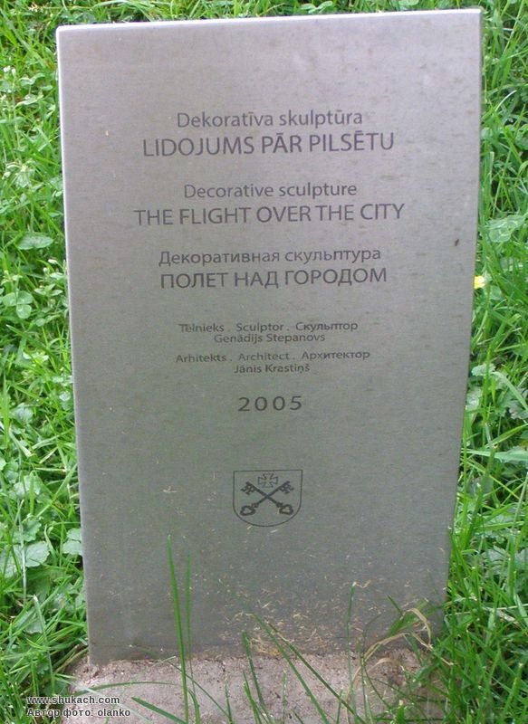 Напис на постаменті пілона увічнює пам'ять засновників «Ризької премії»: «Бізнес-школа Turība, Товариство Ризької премії, Ризька дума, Академія наук». Збоку тераси - інформація про дарувальника: "Спонсор ITERA LATVIJA президент Юріс Савіцкіс". Скульптуру відкрив 8 червня 2005 року голова РД Айварс Аксенокс.