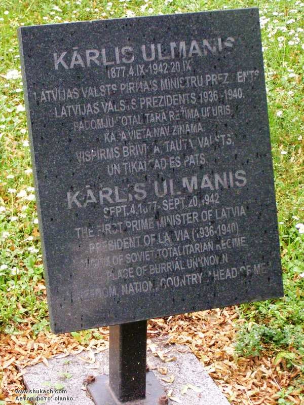 За кілька метрів від пам'ятника, з правого боку, 4 вересня 2006 року було встановлено гранітну дошку з пояснюючим текстом латиською та англійською мовами: «Карліс Улманіс. 1877.4.IX - 1942.20.IX. Перший прем'єр-міністр Латвійської держави, Президент Латвійської держави (1936–1940). Жертва радянського тоталітарного режиму могила невідома». Пам'ятник відкритий 22 липня 2003 - знаменна дата, пов'язана з депортацією К. Улманіса в СРСР в 1940 р. Скульптор Улдіс Курземнієкс, архітектор Арніс Лукшевич.