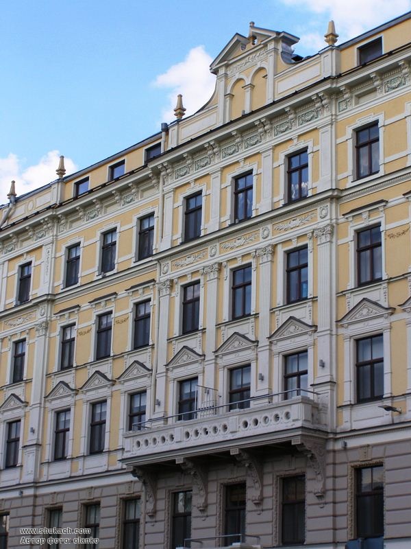 П’ятиповерховий будинок в стилі еклектики з елементами ренесансу і класицизму зведений у 1898 році на проектом архітектора Альфреда Пілеманіса. Він розміщений великим крилом у 11 вісей по вулиці Екаба, а малим, у 5 вісей – по вулиці Торна. Перший поверх відданий під крамниці і офіси. Фасади прикрашені балконами, профільованими пілястрами, різноманітною ліпниною, в основному орнаментами рослинного характеру.