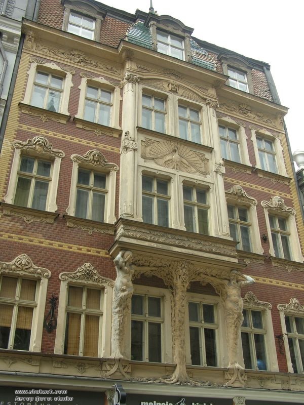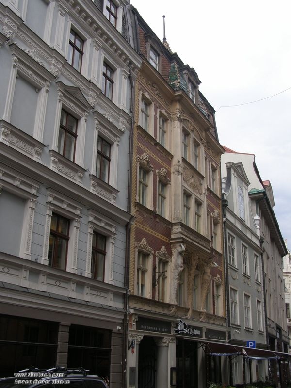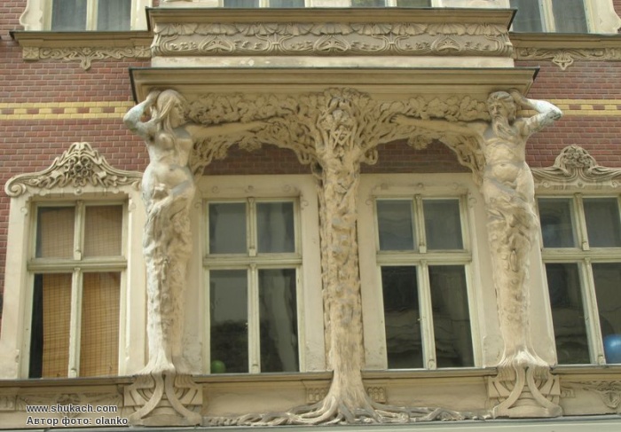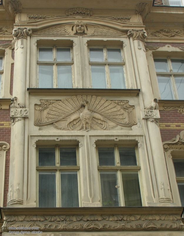 У центрі фасаду будівлі знаходиться двоповерховий еркер, що підтримується фігурами каріатиди та атланта, а також дуб з потужним корінням. Каріатида під еркером – один з найкрасивіших образів жінки в архітектурі ризького модерну. У центрі еркера фігура павича – один із символів краси та впевненості у собі в стилі модерн, а у верхній частині – крилата жіноча голова – символ сонця. Кутові пілястри еркера прикрашені фігурками сови та білки, а також ініціалами власника та цифрами року побудови.