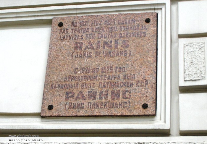Гранітна дошка повідомляє, що у 1921-1925 роках театром керував народний поет Латвії Яніс Райніс. Дошка встановлена на лівій стіні Латвійського Національного театру.