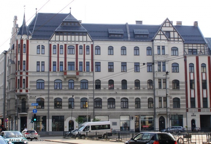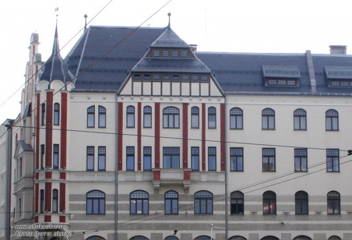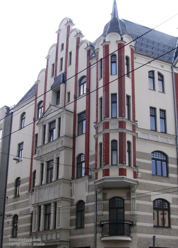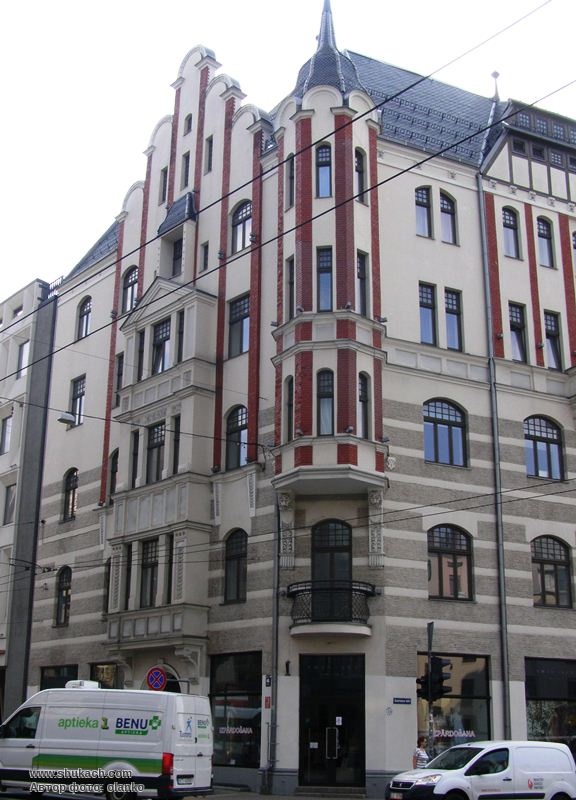 Прибутковий п’ятиповерховий будинок зведений у 1907 році за проектом архітектора Константіна Пекшенса. Раціональний югендстиль. Є також інші елементи – фахверк, характерний для середньовічної архітектури, та еркер на розі будівлі у стилі німецького ренесансу. Пам’ятка архітектури.