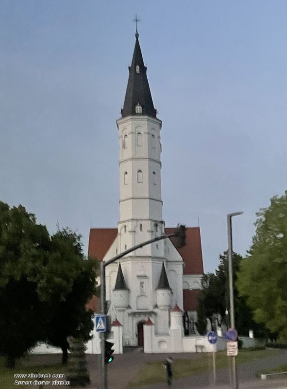 Церква однонавова з трансептом та восьмигранною вежею попереду, висотою близько 70 м. У плані будівля має форму латинського хреста. Простора нава перекрита декорованим циліндричним склепінням. Характерною рисою церкви є подвійні вікна. Верхні круглі вікна служать для освітлення внутрішньої галереї, яка опоясує всю будівлю. Фронтони на торцях трансепту раніше були багато прикрашені у стилі північного Ренесансу. Бічні стіни розчленовані пілястрами із подвійними арками у верхній частині. Головний портал вежі декорований колонами, з'єднаними арковим навершям.