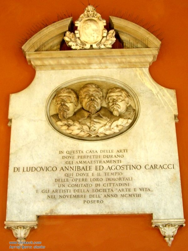 Встановлена на фасаді Національної картинної галереї (пінакотеки) в пам'ять італійських живописців 16-17-го століть Людовіко Караччі і його двоюрідних братів Аннібале і Агостіньо Караччі. Пінакотека названа «храмом їх безсмертних трудів». Крім того, на дошці вказано, що тут у листопаді 1908 року засідав комітет громадян і художників товариства «Arte e vita».